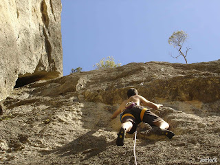 El primer pas de la via ja et posa to. Després un metres de regletes molt guapos i atacar el sostre amb decissió. Sort que sabia on havia d’anar pequè sinó… A partir d’aquí un passet tonto i la resta pur plaer fins el pas final abans de la cadena. Un cop més haurem d’exprimir la imaginació per xapar la R. Ha sortit al flash! El cinquanta per cent de l’encadenament ha sigut mèrit de l’Óscar. Avui la ronda la pago jo. Ell també la treurà bé al segon intent. Està fort “el de Móra”.